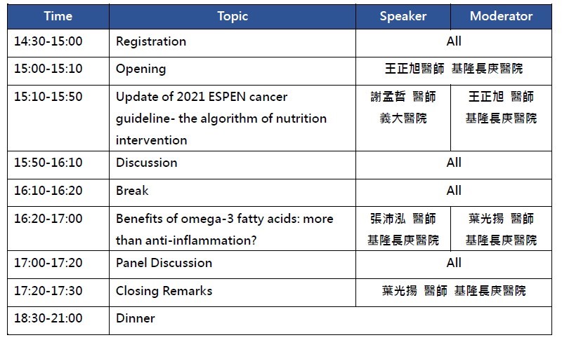 主 題: 癌症營養治療Nutrition therapy: Key to patient-centered care in oncology 主辦單位: 中華癌症營養暨免疫學會 贊助單位: 台灣費森尤斯卡比股份有限公司 日 期: 2021年9月25-26日 地 點: 台南晶英酒店 台南市中西區和意路 1 號