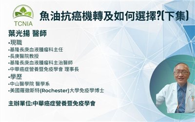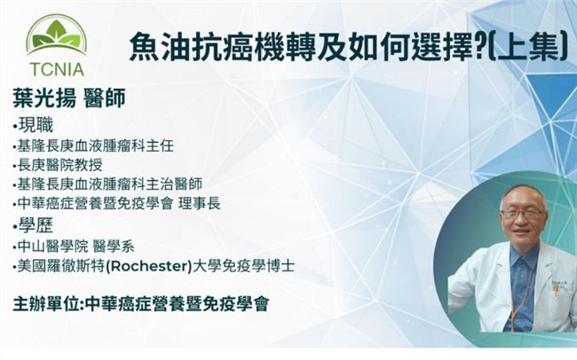 魚油真的抗癌嗎?葉理事長將引用目前之科學證據,加以說明,其魚油用於癌症輔助治療之各種功效及機轉.